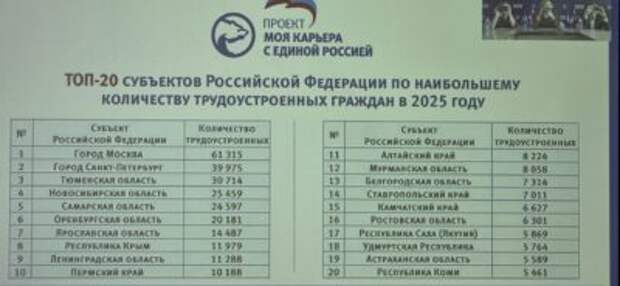 В совещании также участвовали сенаторы, представители профильных министерств, предприниматели и регионы. Андрей Исаев отметил, что при поддержке партии «Единая Россия» трудоустроены 580 тысяч человек, в том числе почти 7 тысяч участников специальной военной операции и 17 тысяч людей с инвалидностью. Всего в мероприятиях проекта приняли участие 1,6 миллиона человек, а за период 2023-2025 годов состоялось порядка 190 тысяч мероприятий, охвативших более 5 миллионов граждан.